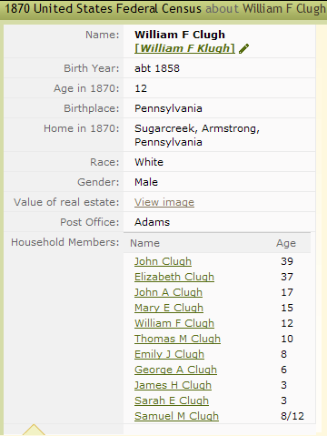 I have the 1880 census is for a William Klugh and his wife Agnes (Fairlie) Klugh. This William is our John's