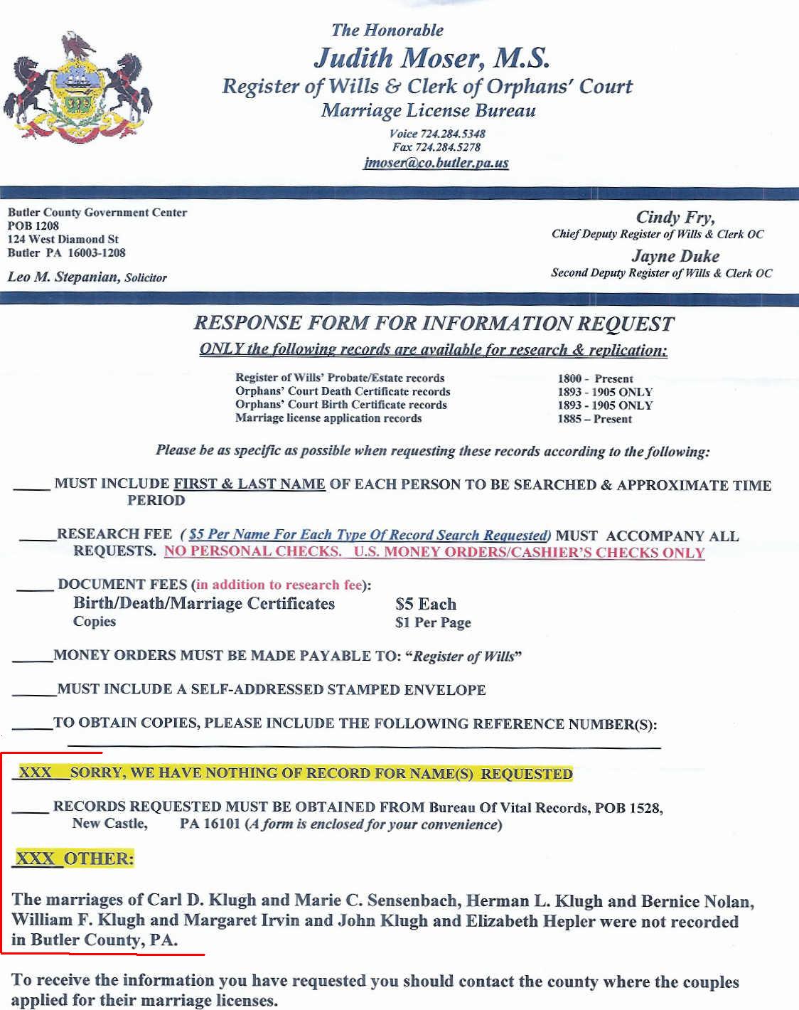 Below are two requests I made for marriage applications: one each to Armstrong and Butler Counties for copies of marriage apps between four generations of Klughs (I made the request prior to finding Herman & Mary's in W. Vir): Carl & Marie, Herman & Mary, William and Margaret, and John & Liz. Neither county had records for any of their marriages.